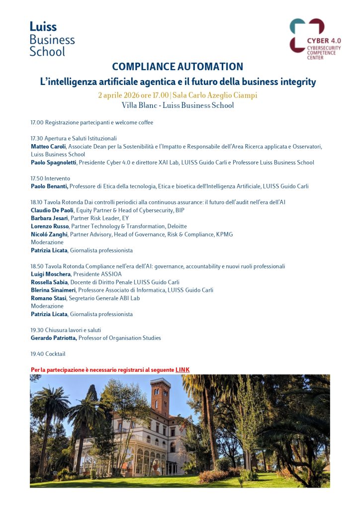 Il secondo incontro, Compliance automation – L’intelligenza artificiale agentica e il futuro della business integrity, avrà luogo giovedì 2 aprile 2026 alle ore 17.00 e offrirà un confronto sui temi dell’intelligenza artificiale applicata alla compliance tra docenti, professionisti e stakeholder istituzionali.